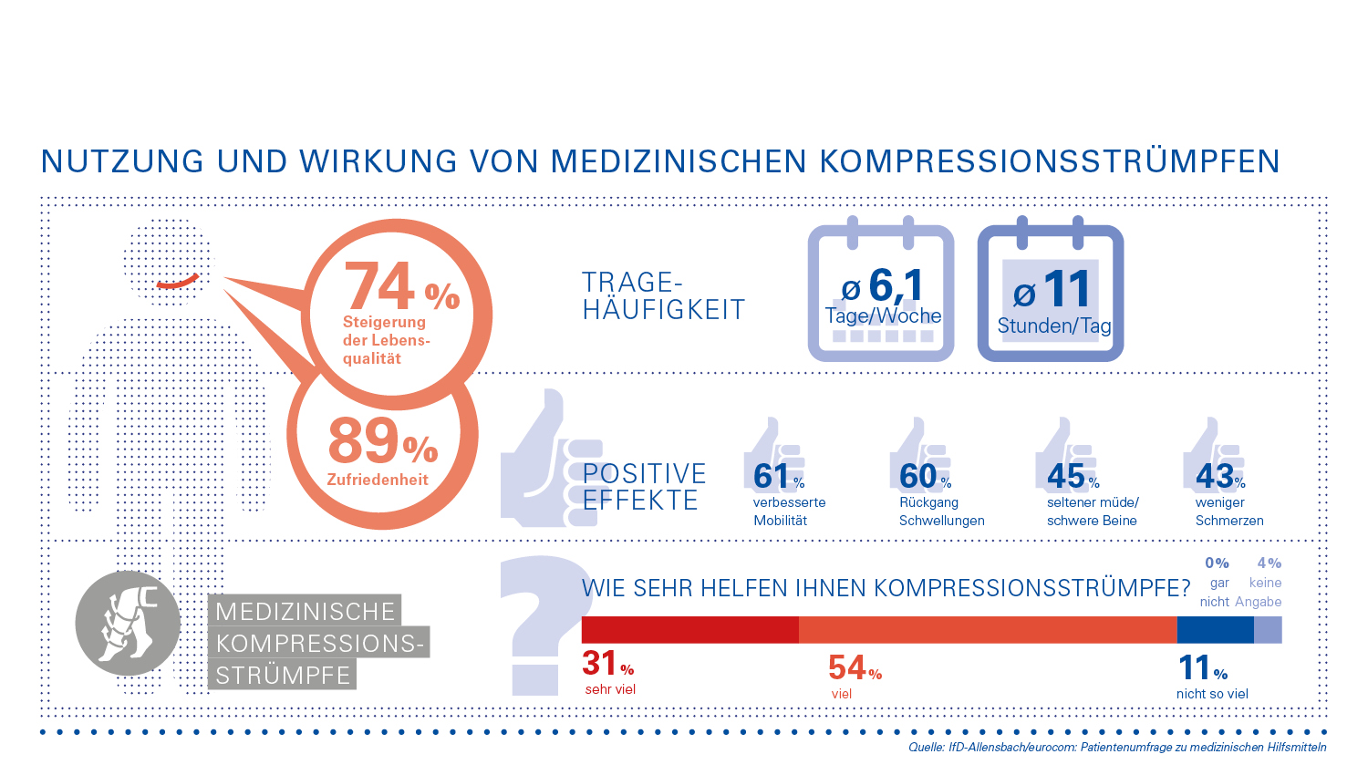 Die hohe Relevanz medizinischer Kompressionsstrümpfe für den therapeutischen Erfolg belegt das Institut für Demoskopie Allensbach mit einer repräsentativen Patientenbefragung. 89 Prozent der Betroffenen sind hochzufrieden mit ihrer Kompressionsversorgung, weil ihre Beschwerden gelindert werden und sie dadurch ihren Alltag wieder besser bewältigen können.